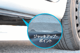 パンクしたタイヤの近くのジャッキアップ・ポイントに、ジャッキをかけます。 |